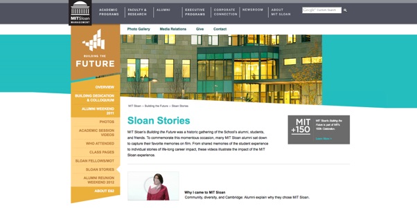 Solution: Sloan Stories, a series of short videos of MIT Sloan alumni sharing their memories of their student experiences and their stories of life-long career impact