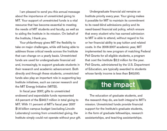 Solution: A brochure that included a letter from the provost, as well as the stories of two students whose education has been supported by unrestricted gifts to the Institute; the brochure also highlighted energy and cancer research, two Institute priorities