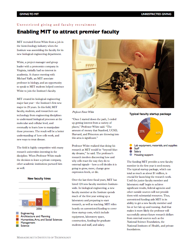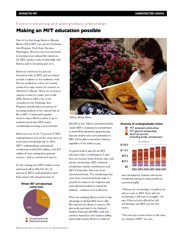 Need: And annual report to donors of unrestricted funds—gifts that could be used at the Institute’s discretion—about how their gift enabled MIT to fulfill its mission. Previously this was done with a simple letter from the provost