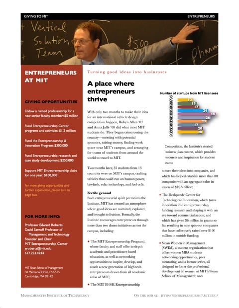 Support for entrepreneurship at MIT is an investment that will be leveraged many times over by students, faculty, staff, and alumni/ae as they turn their ideas into new technologies, cures for diseases, or startup companies. Here are some ways to invest in entrepreneurship at MIT: