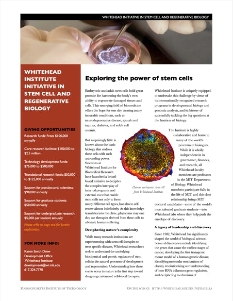 Present restrictions on federal support for research on human embryonic stem cell lines pose a financial obstacle. No other area of biomedical research is so promising, yet so constrained. Private support is needed to allow Whitehead scientists to write the next chapter in stem cell research.