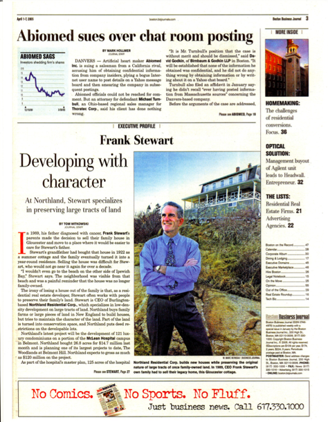 The irony of losing a house out of the family is that, as a residential real estate developer, Stewart often works with people to preserve their family’s land. Stewart is CEO of Northland Residential Corp., which specializes in low-density development on large tracts of land. Northland buys family farms or large pieces of land in New England to build houses, but tries to maintain the character of the land. Part of the land is turned into conservation space, and Northland puts deed restrictions on the development lots.