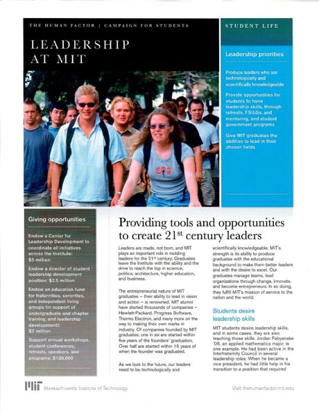 Leadership opportunities permeate life at the Institute. A recent survey by the Division of Student Life and the MIT Leadership Center found more than 150 offerings geared toward producing better leaders on campus.